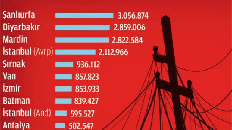 Dağıtım hizmeti verilen iller arasında oransal olarak en fazla kayıp kaçak elektrik kullanımı yüzde 86,1 ile Mardin’de gerçekleşti. Bu kenti kayıp kaçak elektrik kullanımı bakımından yüzde 80,4 ile Şırnak, yüzde 75,3 ile Şanlıurfa, yüzde 72,6 ile Diyarbakır, yüzde 67,6 ile Batman ve yüzde 40,64 ile Siirt izliyor.
