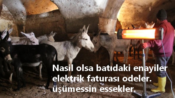 Belki de hayvan damlarına takılan UFO ısıtıcılarının elektrik parasını ödedim. Biz batıda 1 ay elektrik faturası ödemediğimiz halde hemen kesmeye geliyorlar. Adamlar yıllardır elektrik faturası ödemiyorlar ve hiç kimsenin bir şey dediği yok.