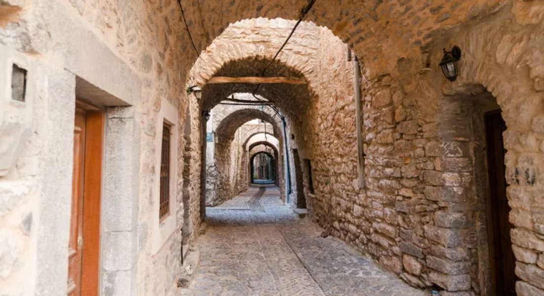 Mesta , one of the medieval-inspired Turkish villages of Chios , is one of the places where you can experience the feeling of time travel with its well-preserved solid stone houses, narrow and labyrinth streets closed with arches.