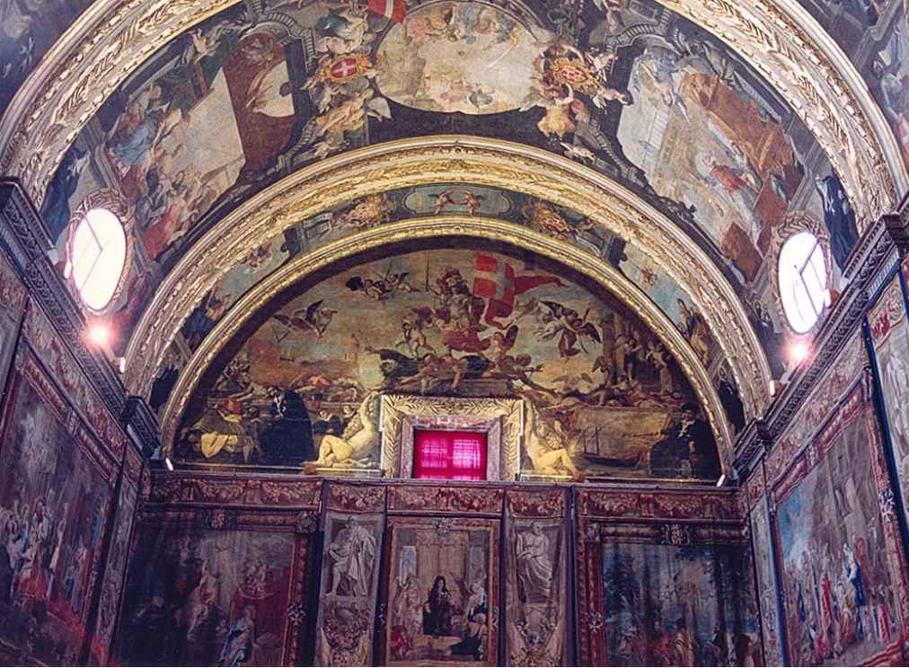 1660'larda mimar Mattia Preti tarafından tasarlanan binanın duvarları ve tavanları tablolar, heykeller, oymalar ve fresklerle bezenmiştir. En önemli tablolarından biri, Carravaggio'nun 1608'de yaptığı Vaftizci Yahya'nın Başının Kesilmesi tablosudur . Bu, yaptığı en büyük tuvaldir ve İtalyan ressamın imzasını taşıyan tek tablodur.