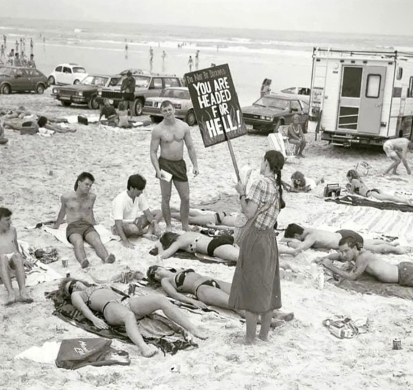 A woman warns beachgoers that their clothing choices are going to send them to hell, 1980s.